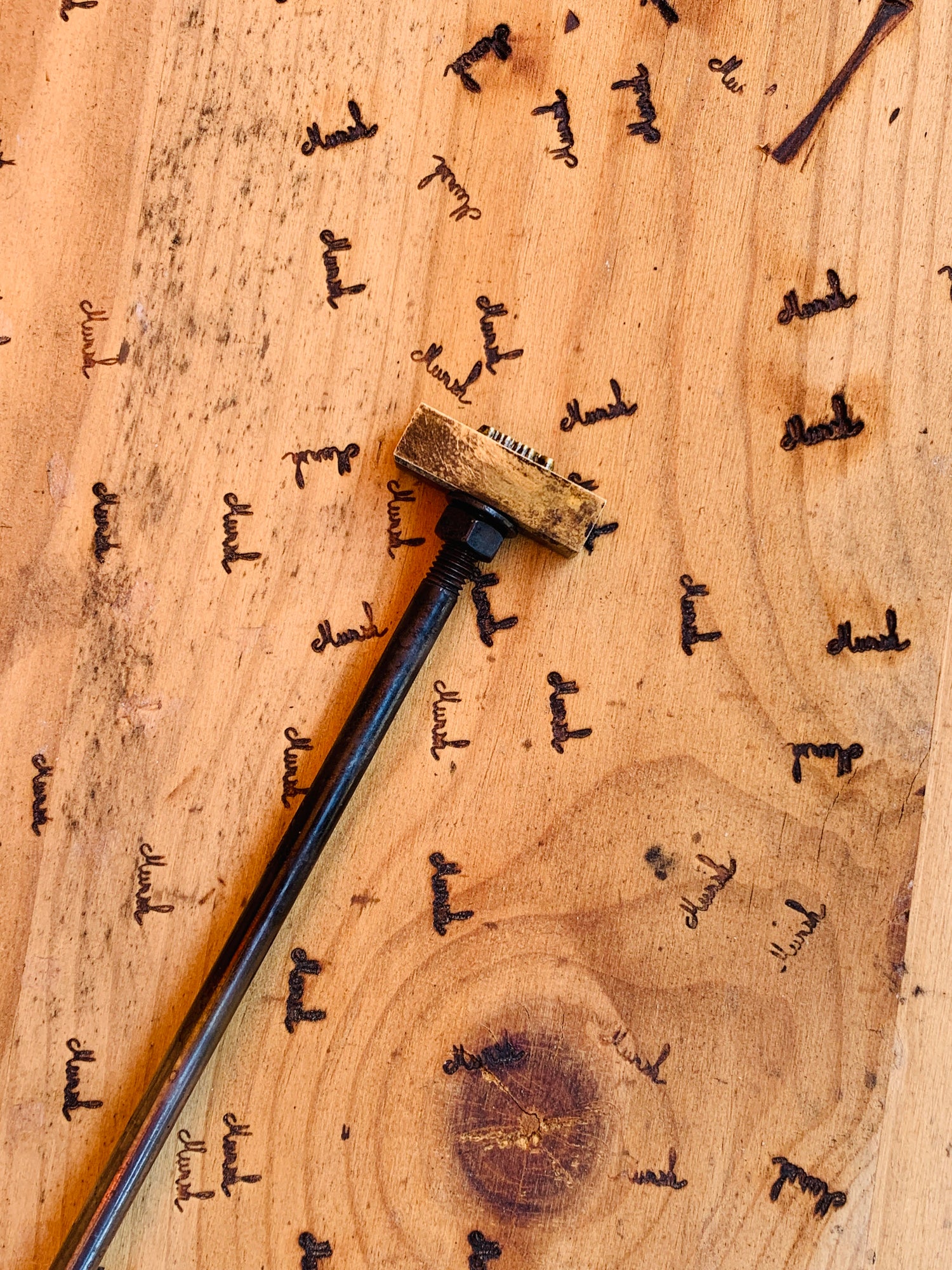Des cadres en bois brut, verni à la main et marqué au fer.