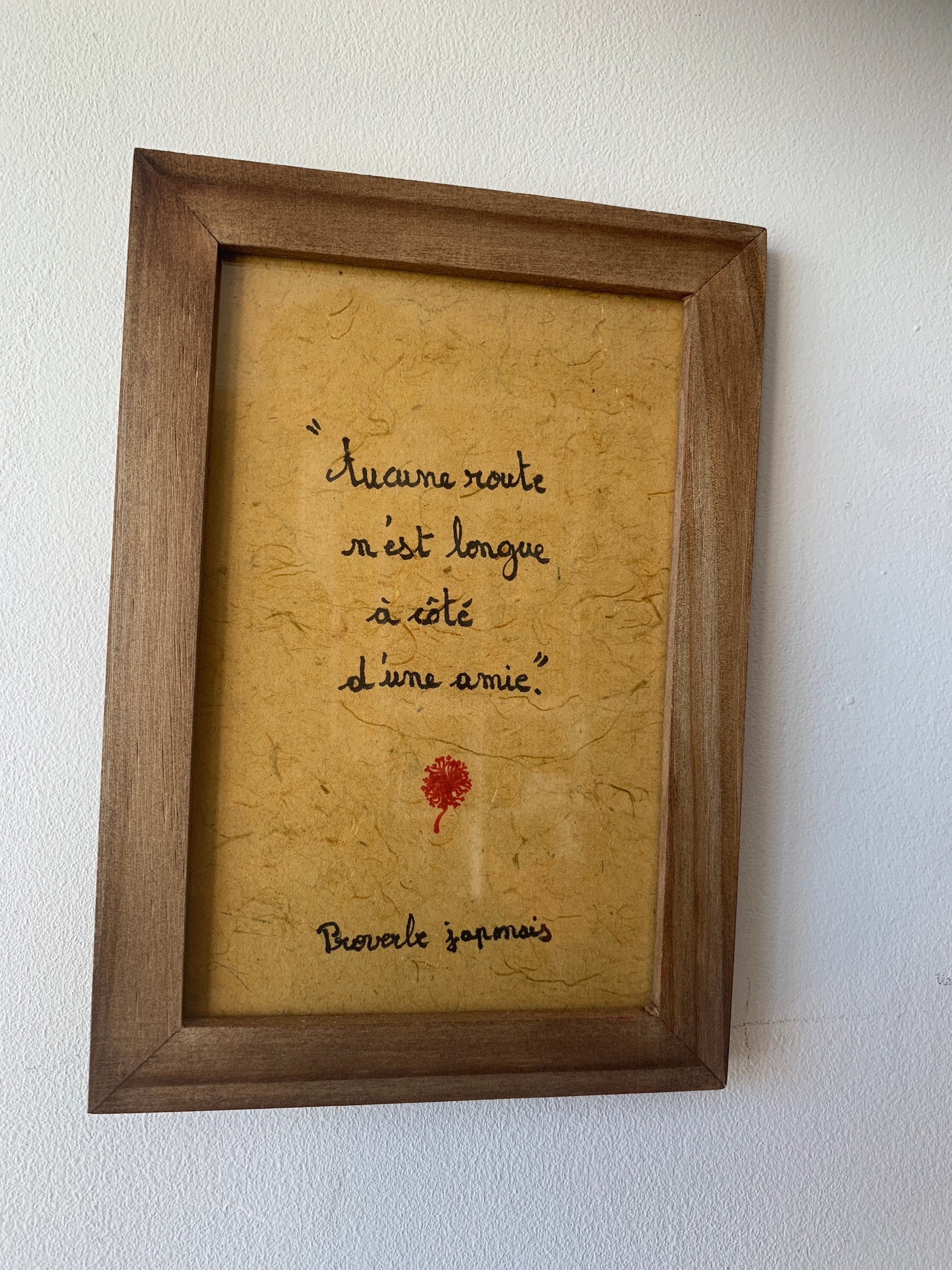 Invitez la sagesse du monde dans votre intérieur avec ce cadre en bois artisanal, au format 15 x 10 cm. Chaque pièce est unique : un proverbe du monde, calligraphié à la main sur un papier népalais ou un papier en fibre de soie, est mis en valeur par un cadre façonné avec soin.