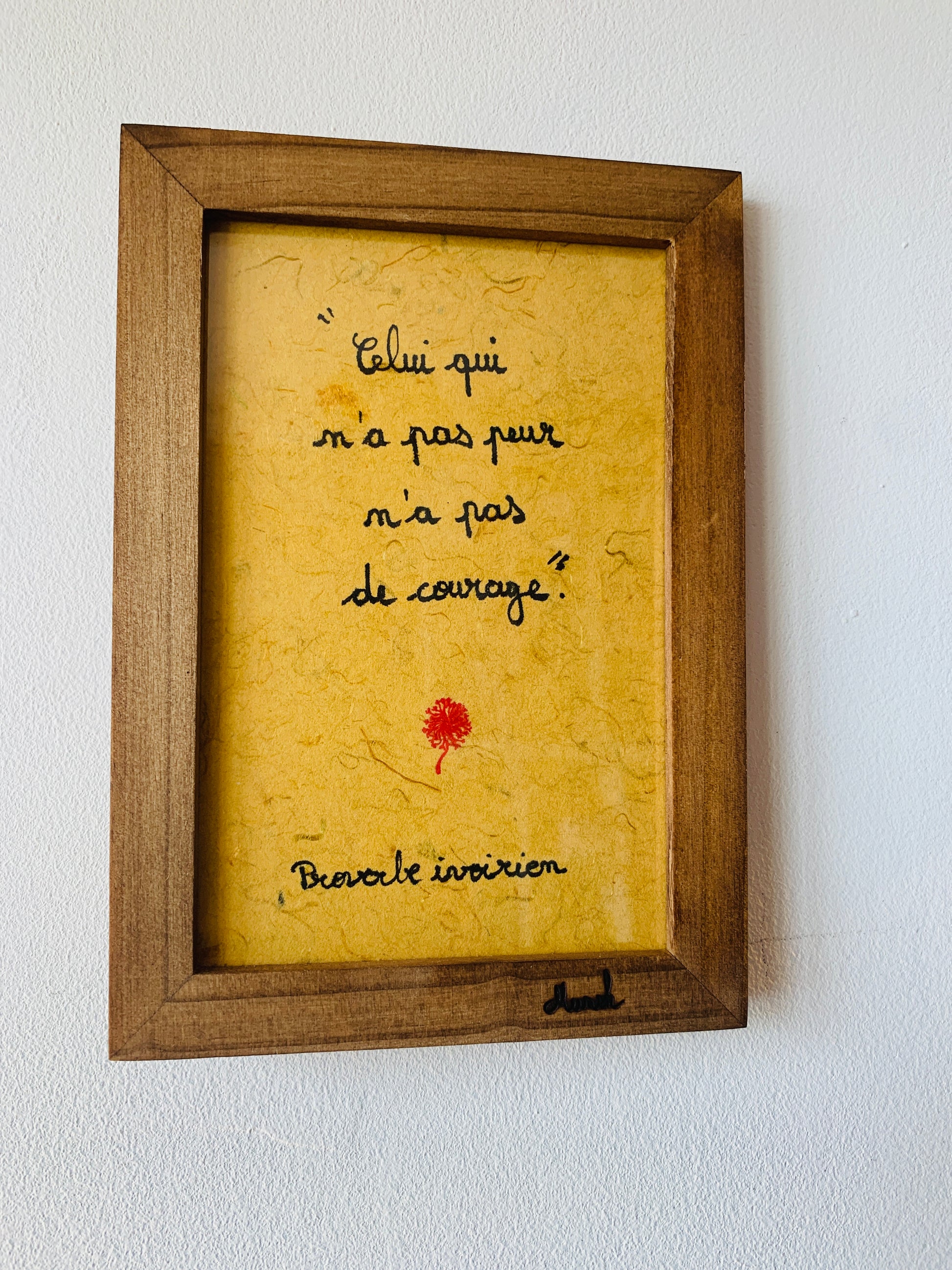 Invitez la sagesse du monde dans votre intérieur avec ce cadre en bois artisanal, au format 15 x 10 cm. Chaque pièce est unique : un proverbe du monde, calligraphié à la main sur un papier népalais ou un papier en fibre de soie, est mis en valeur par un cadre façonné avec soin.