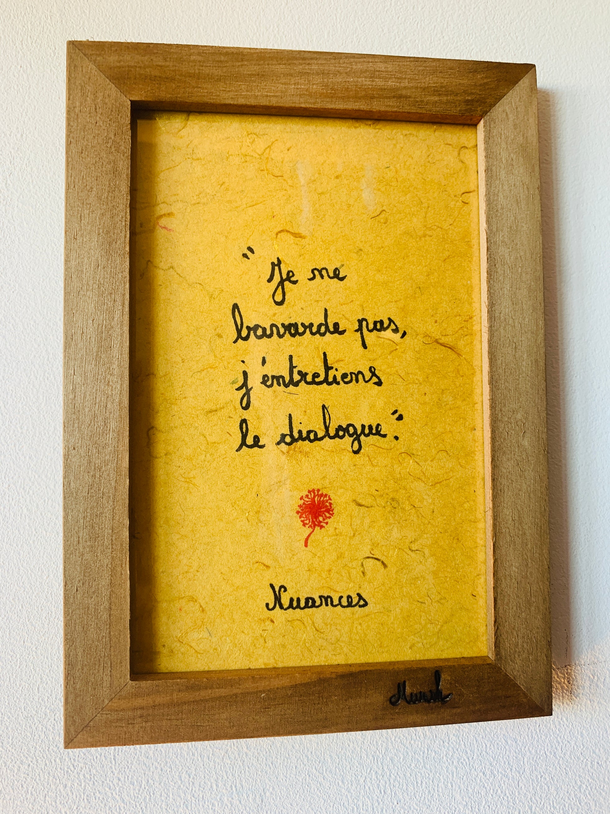 Célébrez vos petits travers ou ceux de vos amis avec ce cadre en bois artisanal, au format 15 x 10 cm. Chaque pièce est unique : une nuance, calligraphiée à la main sur un papier népalais ou un papier en fibre de soie, est mis en valeur par un cadre façonné avec soin.