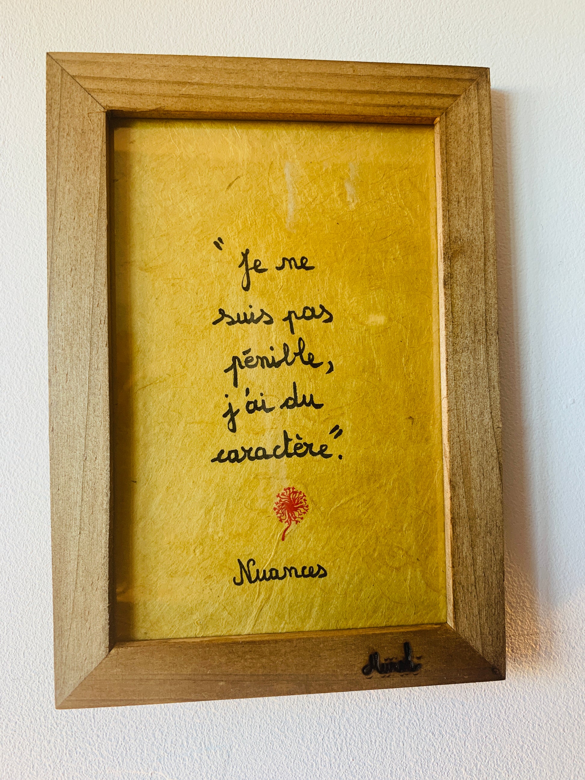 Célébrez vos petits travers ou ceux de vos amis avec ce cadre en bois artisanal, au format 15 x 10 cm. Chaque pièce est unique : une nuance, calligraphiée à la main sur un papier népalais ou un papier en fibre de soie, est mis en valeur par un cadre façonné avec soin.