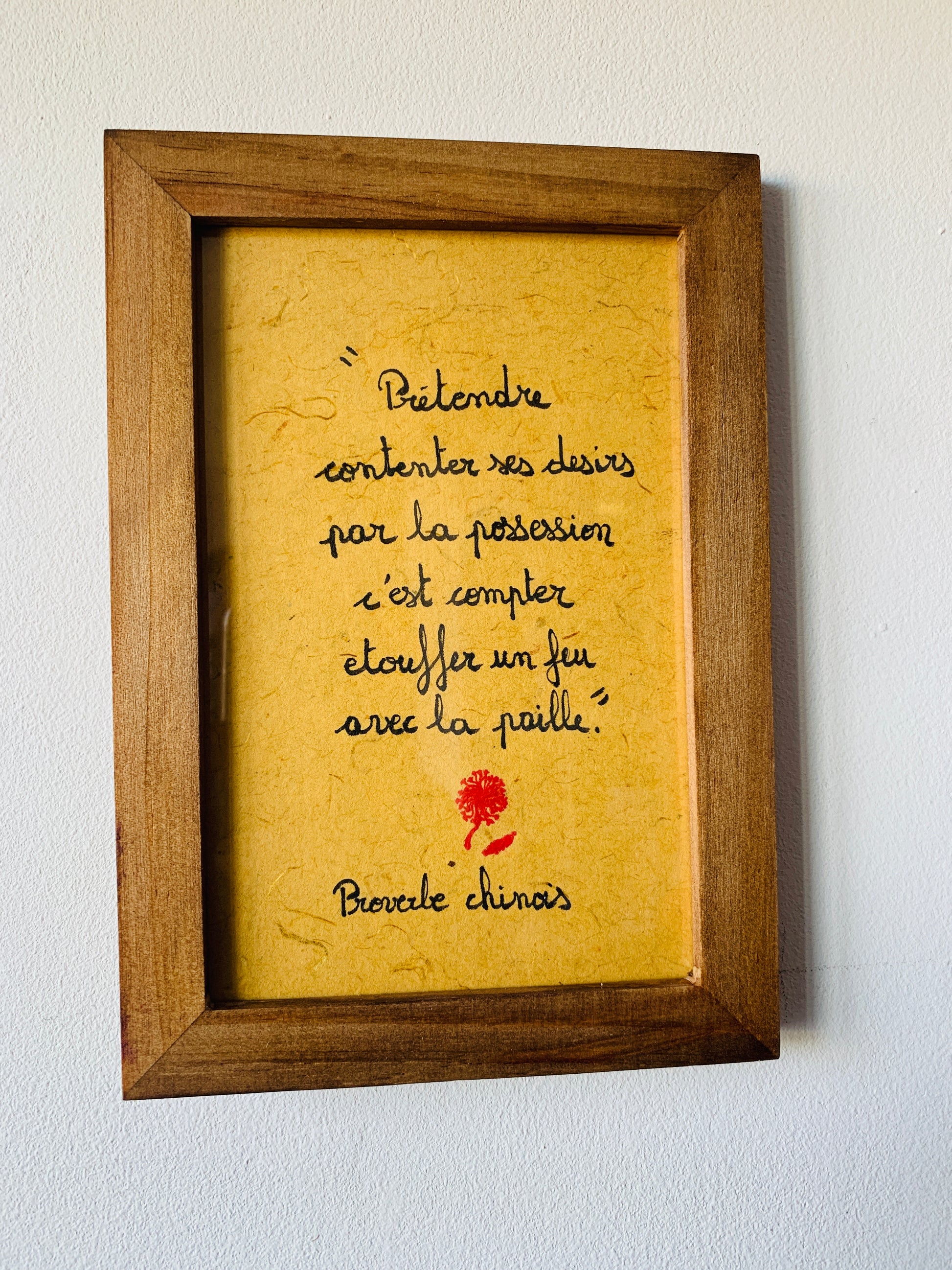 Invitez la sagesse du monde dans votre intérieur avec ce cadre en bois artisanal, au format 15 x 10 cm. Chaque pièce est unique : un proverbe du monde, calligraphié à la main sur un papier népalais ou un papier en fibre de soie, est mis en valeur par un cadre façonné avec soin.